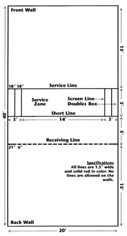 Pratiqué sur un terrain fermé (12,20 m de profondeur, 6,10 m de largeur et 6,10 m sous plafond), on peut utiliser toutes les surfaces pour faire rebondir la balle vers le mur frontal. La balle officielle fait 5,71 cm de diamètre et pèse environ 39,7 g[1]