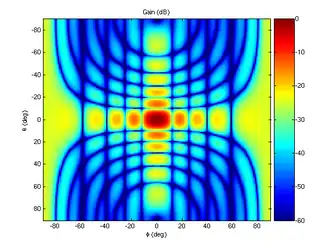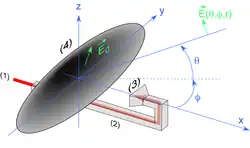 Soit à mesurer l'amplitude de l'onde émise dans une direction repérée par les angles (angle azimutal horizontal ou gisement) et (angle d'élévation ou de site), et mesurée à une distance de l'antenne suffisamment grande pour que l'approximation de Fraunhofer soit vérifiée. La théorie de la diffraction montre que celle-ci vaut :