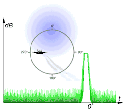 - on peut également noter la variation de fréquence de l'onde émise par rapport à celle reçue lorsqu'on émet continuellement à une fréquence fixe. Il s'agit là de l'utilisation de l'Effet Doppler-Fizeau. Comme on ne fait pas varier la fréquence émise, on ne peut cependant pas définir la position de la cible de cette manière. En plus, on n'a que la composante radiale au radar de la vitesse. Par exemple, une cible se déplaçant perpendiculaire au faisceau radar ne causera pas de changement de fréquence alors que la même cible se déplaçant vers le radar à la même vitesse provoquera un changement maximal ;