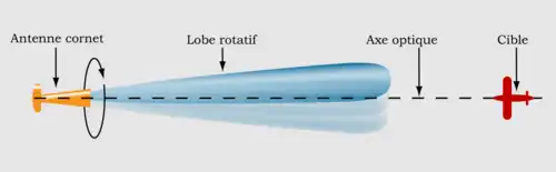Une cible centrée sur l'axe optique sera alors en permanence placée au barycentre du lobe et renverra donc un signal de niveau constant. Si la cible est sur le côté, elle ne renverra d'écho que lorsque le lobe — au cours de sa rotation — sera pointé vers elle, il en résultera un signal moyen plus faible, ou intermittent si la vitesse de rotation est suffisamment lente ce qui se traduit par une modulation d'amplitude du signal reçu à la fréquence de rotation du réflecteur secondaire. En maintenant l'antenne dirigée vers la cible pour supprimer la modulation d'amplitude du signal on pourra faire une poursuite automatique de celle-ci.