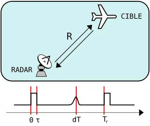 La manière de mesurer la distance à un objet est d'émettre une courte impulsion de signal radio, et de mesurer le temps que prend l'onde pour revenir après avoir été réfléchie. La distance (R) est la moitié du temps de retour de l'onde (car le signal doit aller à la cible puis revenir) multipliée par la vitesse du signal (qui est proche de la vitesse de la lumière dans le vide si le milieu traversé est l'atmosphère).