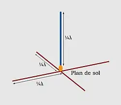 Pour des dimensions plus petites, une antenne ground plane de 1/4 onde peut être construite avec une tige verticale de longueur d'onde divisée par 4, reliée à l'âme d'un câble coaxial, et quatre tiges de même longueur reliées à la tresse, formant un X sous cette première tige.