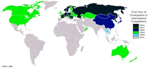 Le premier championnat mondial s'est tenu à Cetniewo (Pologne),en 1980, et a rassemblé des concurrents de onze pays européens et asiatiques. Depuis 1984 les championnats mondiaux ont lieu les années paires, sauf pour l'année 1996 qui a vu le championnat décalé à 1997. Les pays asiatiques ont participé à partir de 1980 et les pays d'Océanie et l'Amérique du Nord les ont rejoints dans les années 1990. En 2000, ce sont les athlètes de 26 pays qui se sont retrouvés à Nankin (Chine) pour la première compétition hors d'Europe.
