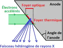 Les rayons X sont produits par un tube à rayons X. C'est un tube sous vide composé d'un filament chauffé alimenté par le courant continu de haute tension. L'intensité de ce courant (en mA) multipliée par le temps de pose (durée d'application du courant en s), sera directement lié au nombre de photons produits. En radiologie, ce paramètre correspond à la charge du tube en mAs. La haute tension est appliquée entre ce filament (cathode) et une cible (anode). Les électrons sont accélérés par cette tension et viennent bombarder l'anode. Celle-ci est composée d'un élément de fort numéro atomique afin de privilégier les interactions par rayonnement de freinage. Ces interactions électroniques produisent un spectre continu de rayons X dont l'énergie maximum correspond à l'énergie cinétique des électrons, donc à la tension appliquée. En médecine, on parle ainsi de kilovoltage (kV) pour qualifier le spectre en énergie des rayons X utilisés. Mais la plus grande part de l'énergie cinétique des électrons est convertie en chaleur au niveau du foyer thermique ce qui peut contribuer à le détériorer malgré le système de refroidissement. Pour cela, l'anode est souvent constituée d'un grand et d'un petit foyer. Le grand foyer a l'avantage de mieux dissiper la chaleur lors de clichés nécessitant beaucoup de mAs mais est à l'origine d'un plus grand flou géométrique au niveau de l'image. Tous ces paramètres sont réglables au niveau du pupitre de commande : kilovoltage, milliampères, temps de pose, taille du foyer. Un posemètre peut être placé en amont du détecteur de façon à asservir le temps de pose voire les milliampères. Il est réglé de façon que le détecteur reçoive la quantité optimale de photons, en prenant en compte les contraintes de radioprotection du patient.
