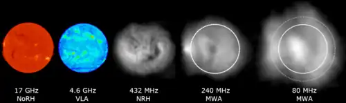 Dans le domaine radio, le Soleil émet surtout des longueurs d'onde situées entre 1 et 10 centimètres[9]. Ces ondes proviennent de la perturbation du champ magnétique solaire[9].