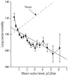 - ↑ (en) Bernard L. Cohen, Correllation between mean radon levels and lung cancer rates in US counties: a test of the Linear-No Threshold theory [PDF], University of Pittsburgh, 1988.