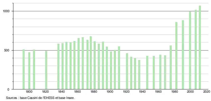 L'évolution du nombre d'habitants est connue à travers les recensements de la population effectués dans la commune depuis 1793. À partir du , les populations légales des communes sont publiées annuellement dans le cadre d'un recensement qui repose désormais sur une collecte d'information annuelle, concernant successivement tous les territoires communaux au cours d'une période de cinq ans. Pour les communes de moins de 10 000 habitants, une enquête de recensement portant sur toute la population est réalisée tous les cinq ans, les populations légales des années intermédiaires étant quant à elles estimées par interpolation ou extrapolation[9]. Pour la commune, le premier recensement exhaustif entrant dans le cadre du nouveau dispositif a été réalisé en 2006[10],[Note 1].