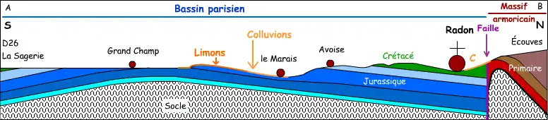 La coupe ci-contre passe par l'ancienne grande ferme industrielle d'Avoise. La partie armoricaine, d'âge primaire, montre un anticlinal hercynien (= varisque) ; la partie secondaire présente des couches théoriquement sub-horizontales (structure monoclinale), mais dans la réalité, légèrement ondulées.