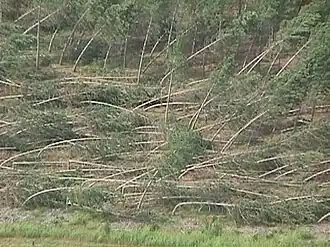 - une tornade est formée par de l'air en rotation et en ascension. Il y aura donc des signes de rotation dans la zone de dégâts comme des arbres tordus. Les débris se retrouveront également dans des directions diverses dans et en bordure du corridor, selon le flanc du tourbillon qui les a fauchés. Les arbres ou structures seront souvent sectionnés à quelques mètres du sol dans le corridor de dommages ;