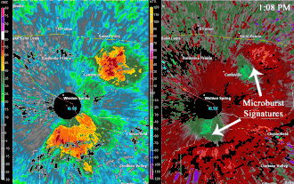 Du côté de la détection, il faut utiliser les données de vents radiaux. Ainsi, à mi-hauteur de l'orage, l'observateur peut noter une convergence qui peut indiquer le développement d'une rafale descendante. Cela sera suivi par des zones de vents divergents près de la surface, indiquant qu'une rafale descendante atteint le sol comme dans l'image ci-contre. Cependant, plus l'orage est loin du radar, plus cette signature est difficile à repérer car la résolution horizontale et azimutale des données diminue[4].