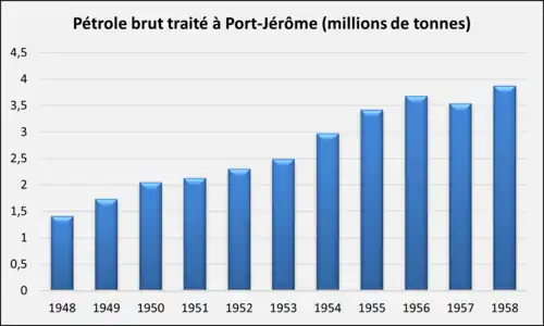 En onze ans de fonctionnement, le tonnage de pétrole brut traité à Port-Jérôme a été multiplié par 2,75. Le tassement de 1957 est la conséquence de la crise de Suez entraînant la fermeture temporaire du canal, l'allongement des délais de transport et la réduction de la production. Pour réguler les approvisionnements en France, les raffineurs ont conclu, dès le début de la crise, un accord de solidarité permettant de se répartir équitablement le brut entre raffineries. Esso, mieux pourvue en brut que ses consœurs, leur rétrocède du pétrole et réduit d'autant sa production[24]. La mise en service de la raffinerie de Bordeaux en , dont la création avait été décidée au printemps 1955, marque la fin de la période de reconstruction/rénovation de la raffinerie Port-Jérôme qui s'ouvre désormais au développement de la pétrochimie.