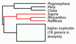 Bien qu'elle soit classée, dans une famille spécifique dite des Rafflesiaceae, des études récentes portant sur 11 500 paires de bases du génome de la plante la rapprochent des Euphorbiaceae desquelles elle se serait différenciée il y a 46 millions d'années. Les différences avec les autres Angiospermes s’avèrent telles que l’on a du mal à les classer dans l’arbre de parentés[1].