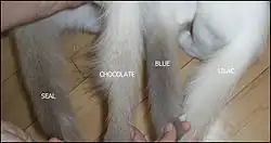 le seal, le bleu, le chocolat, le lilas, le roux, le crème, le cannelle, le faon, l'argent, l'écaille de tortue, le smoke, le tabby (dit lynx), le torbie, etc[11].