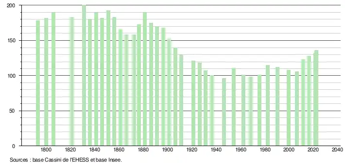 L'évolution du nombre d'habitants est connue à travers les recensements de la population effectués dans la commune depuis 1793. Pour les communes de moins de 10 000 habitants, une enquête de recensement portant sur toute la population est réalisée tous les cinq ans, les populations de référence des années intermédiaires étant quant à elles estimées par interpolation ou extrapolation[16]. Pour la commune, le premier recensement exhaustif entrant dans le cadre du nouveau dispositif a été réalisé en 2006[17].