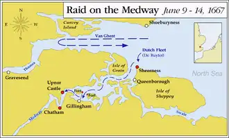 Les Néerlandais, sous les ordres du lieutenant-amiral Michiel de Ruyter, bombardèrent et prirent Sheerness, remontèrent la Tamise en brisant les chaînes bloquant l'accès au fleuve jusqu'à Gravesend, puis la rivière Medway jusqu'à Chatham, où ils brûlèrent trois navires de commerce et dix navires de la Royal Navy et s'emparèrent du Unity et du Royal Charles, navire amiral et orgueil de la flotte anglaise.