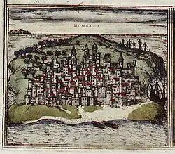 La flotte arrive devant Mombassa le et y trouve Mir Ali Bey et ses corsaires qui ont organisé leur défense à l'intérieur d'un fort à l'entrée du port[9]. Très vite, ils sont débordés par les troupes portugaises, bien plus nombreuses, et Mir Ali prend la fuite à cheval vers la ville où se trouve le sultan de Mombassa[9]. Les Portugais réduisent entièrement la résistance ottomane et se saisissent de deux de leurs galères chargées d'un butin d'or, d'argent, d'ambre, d'étoffes et d'esclaves[9].