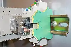 Deux disjoncteurs montés sur rail DIN de type TH 35-7,5 plein (vue de derrière)