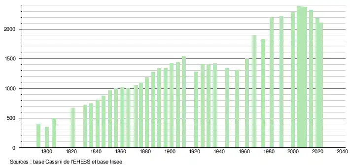L'évolution du nombre d'habitants est connue à travers les recensements de la population effectués dans la commune depuis 1793. Pour les communes de moins de 10 000 habitants, une enquête de recensement portant sur toute la population est réalisée tous les cinq ans, les populations de référence des années intermédiaires étant quant à elles estimées par interpolation ou extrapolation[33]. Pour la commune, le premier recensement exhaustif entrant dans le cadre du nouveau dispositif a été réalisé en 2004[34].