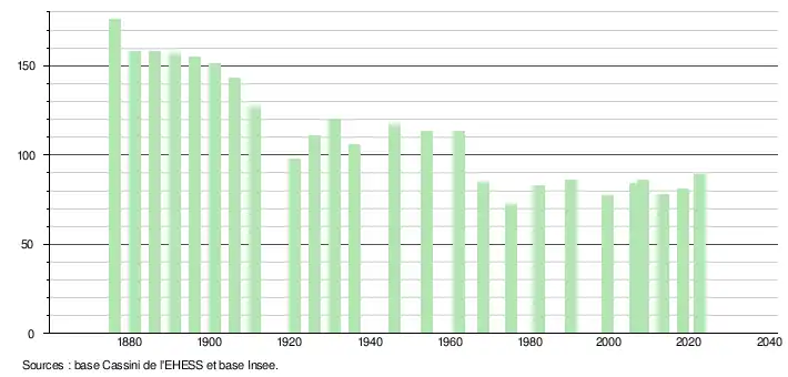 L'évolution du nombre d'habitants est connue à travers les recensements de la population effectués dans la commune depuis 1876. Pour les communes de moins de 10 000 habitants, une enquête de recensement portant sur toute la population est réalisée tous les cinq ans, les populations de référence des années intermédiaires étant quant à elles estimées par interpolation ou extrapolation[25]. Pour la commune, le premier recensement exhaustif entrant dans le cadre du nouveau dispositif a été réalisé en 2008[26].