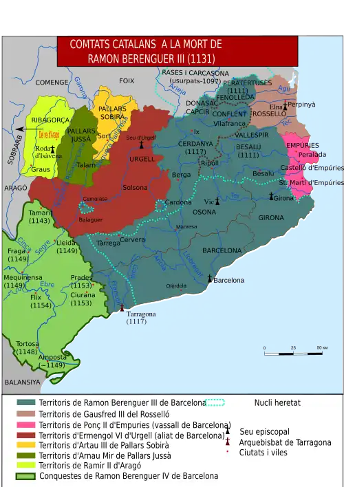 Enfin, en 1128, Raimond-Bérenger III combat le comte d'Ampurias, Pons II, et le fait prisonnier. Il obtient que celui-ci abandonne la région de Peralada, qui passe à Barcelone.
