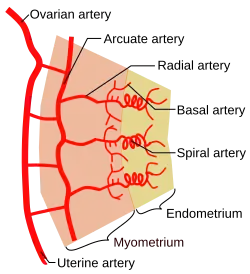 L'artère utérine donnent de nombreux rameaux pénétrant la paroi utérine. Ces rameaux s'anastomosent entre eux pour former un arc artériel (arcuate artery) dans le myomètre. De ces arc artériels naissent des artères radiales qui pénètrent plus profondément dans le myomètre jusqu'à sa limite avec l'endomètre. A ce niveau elles deviennent des rameaux spiralés qui pénètrent dans l'endomètre : les rameaux hélicins de l'artère utérine.