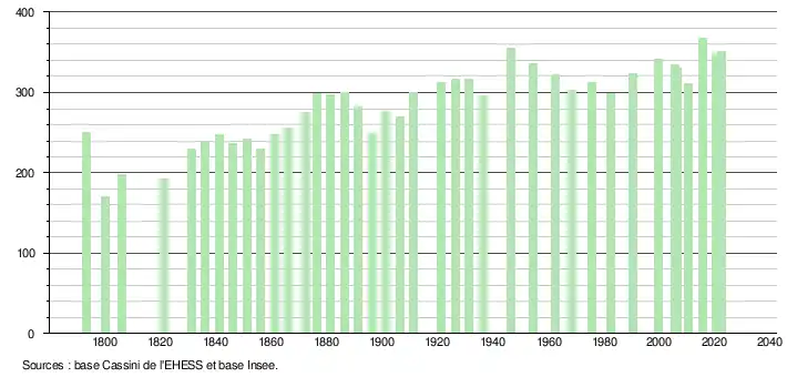 L'évolution du nombre d'habitants est connue à travers les recensements de la population effectués dans la commune depuis 1793. Pour les communes de moins de 10 000 habitants, une enquête de recensement portant sur toute la population est réalisée tous les cinq ans, les populations de référence des années intermédiaires étant quant à elles estimées par interpolation ou extrapolation[31]. Pour la commune, le premier recensement exhaustif entrant dans le cadre du nouveau dispositif a été réalisé en 2005[32].