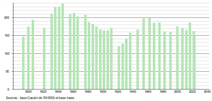 L'évolution du nombre d'habitants est connue à travers les recensements de la population effectués dans la commune depuis 1793. Pour les communes de moins de 10 000 habitants, une enquête de recensement portant sur toute la population est réalisée tous les cinq ans, les populations de référence des années intermédiaires étant quant à elles estimées par interpolation ou extrapolation[29]. Pour la commune, le premier recensement exhaustif entrant dans le cadre du nouveau dispositif a été réalisé en 2006[30].