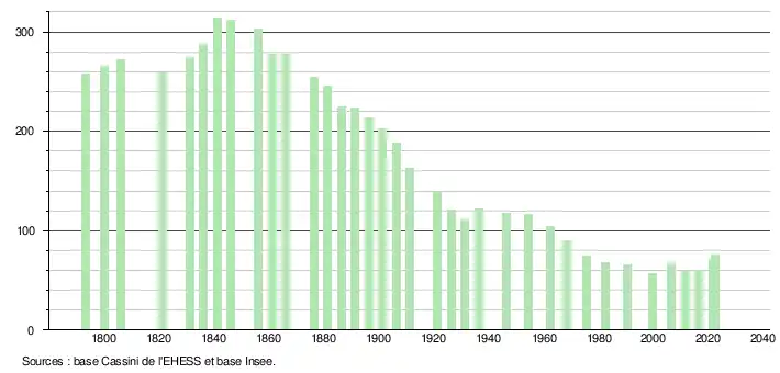 L'évolution du nombre d'habitants est connue à travers les recensements de la population effectués dans la commune depuis 1793. Pour les communes de moins de 10 000 habitants, une enquête de recensement portant sur toute la population est réalisée tous les cinq ans, les populations de référence des années intermédiaires étant quant à elles estimées par interpolation ou extrapolation[39]. Pour la commune, le premier recensement exhaustif entrant dans le cadre du nouveau dispositif a été réalisé en 2006[40].