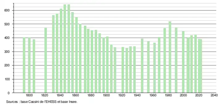 L'évolution du nombre d'habitants est connue à travers les recensements de la population effectués dans la commune depuis 1793. Pour les communes de moins de 10 000 habitants, une enquête de recensement portant sur toute la population est réalisée tous les cinq ans, les populations de référence des années intermédiaires étant quant à elles estimées par interpolation ou extrapolation[21]. Pour la commune, le premier recensement exhaustif entrant dans le cadre du nouveau dispositif a été réalisé en 2005[22].