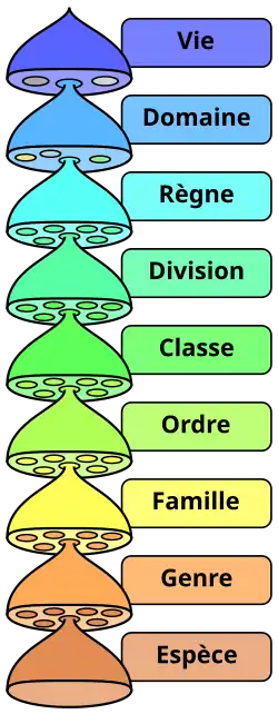 Les rangs taxonomiques[14] utilisés en systématique linnéenne pour indiquer la hiérarchie entre les taxons nommés dans la classification du monde vivant sont les suivants (par ordre décroissant) :