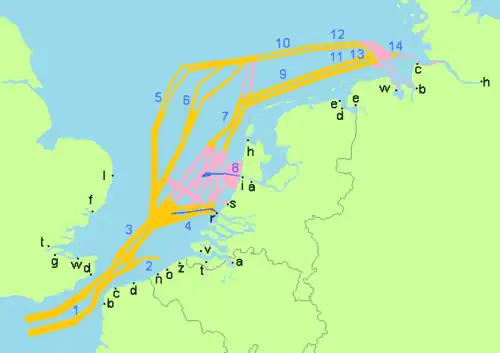 - cargo divers : ports d'Anvers, de Zélande[n 5], de Bremerhaven, d'Amsterdam, de Rotterdam, de Gant, de Hambourg et du Havre ;