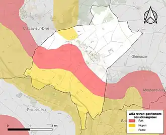 Les mouvements de terrains susceptibles de se produire sur la commune sont des affaissements et effondrements liés aux cavités souterraines (hors mines) et des tassements différentiels[22]. Afin de mieux appréhender le risque d’affaissement de terrain, un inventaire national permet de localiser les éventuelles cavités souterraines sur la commune[23]. Le retrait-gonflement des sols argileux est susceptible d'engendrer des dommages importants aux bâtiments en cas d’alternance de périodes de sécheresse et de pluie[24]. 54 % de la superficie communale est en aléa moyen ou fort (79,5 % au niveau départemental et 48,5 % au niveau national)[25]. Depuis le , en application de la loi ÉLAN, différentes contraintes s'imposent aux vendeurs, maîtres d'ouvrages ou constructeurs de biens situés dans une zone classée en aléa moyen ou fort[Note 3],[26].