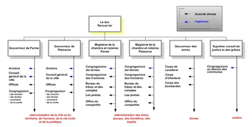 En 1594 et 1595, il promulgue les Constitutions (Constitutiones) qui s'inspirent de l'État voisin, Milan[44] et qui s'appuient sur l'ancien droit romain. Elles resteront en vigueur pendant toute la période farnèse[45]. Ces constitutions se composent de trois groupes de règlements qui organisent, pour les premiers, les charges les plus importantes de l'État, pour les seconds, les procès civils et pour les troisièmes, la fiscalité et le patrimoine du prince[44]. La vraie nouveauté est le fait que les représentants du duc, remplaçant les podestà disposent des principaux pouvoirs[45]. Ainsi ces gouverneurs convoquent les conseils, fixent l'ordre du jour, gèrent le déroulement des travaux et approuvent les délibérations avant leurs exécutions[46]. Ces constitutions s'accompagnent d'un texte sur les ordres et privilèges militaires[44]. Une milice locale est constituée de quelques centaines d'hommes qui complète les troupes mercenaires composées de Suisses, d'Irlandais et de Corses[47]. Ils sont complétés, en 1597, d'un texte sur la tutelle de la religion catholique. Par un règlement de 1589, il décrète que les Juifs bénéficient des mêmes droits que les habitants du duché, qu'il ne leur est pas fait obligation de porter un signe distinctif et qu'ils doivent verser une redevance semestrielle de 250 ducatoni[44].