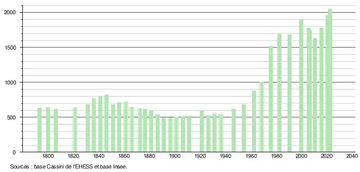L'évolution du nombre d'habitants est connue à travers les recensements de la population effectués dans la commune depuis 1793. Pour les communes de moins de 10 000 habitants, une enquête de recensement portant sur toute la population est réalisée tous les cinq ans, les populations de référence des années intermédiaires étant quant à elles estimées par interpolation ou extrapolation[38]. Pour la commune, le premier recensement exhaustif entrant dans le cadre du nouveau dispositif a été réalisé en 2005[39].