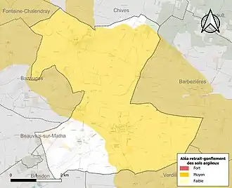 Le retrait-gonflement des sols argileux est susceptible d'engendrer des dommages importants aux bâtiments en cas d’alternance de périodes de sécheresse et de pluie. 80,1 % de la superficie communale est en aléa moyen ou fort (67,4 % au niveau départemental et 48,5 % au niveau national). Sur les 122 bâtiments dénombrés sur la commune en 2019, 115 sont en aléa moyen ou fort, soit 94 %, à comparer aux 81 % au niveau départemental et 54 % au niveau national. Une cartographie de l'exposition du territoire national au retrait gonflement des sols argileux est disponible sur le site du BRGM[18],[Carte 3].