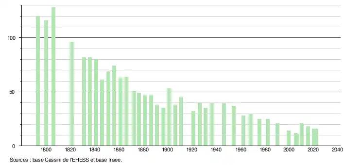 L'évolution du nombre d'habitants est connue à travers les recensements de la population effectués dans la commune depuis 1793. Pour les communes de moins de 10 000 habitants, une enquête de recensement portant sur toute la population est réalisée tous les cinq ans, les populations de référence des années intermédiaires étant quant à elles estimées par interpolation ou extrapolation[19]. Pour la commune, le premier recensement exhaustif entrant dans le cadre du nouveau dispositif a été réalisé en 2005[20].