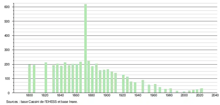 L'évolution du nombre d'habitants est connue à travers les recensements de la population effectués dans la commune depuis 1800. Pour les communes de moins de 10 000 habitants, une enquête de recensement portant sur toute la population est réalisée tous les cinq ans, les populations de référence des années intermédiaires étant quant à elles estimées par interpolation ou extrapolation[16]. Pour la commune, le premier recensement exhaustif entrant dans le cadre du nouveau dispositif a été réalisé en 2006[17].