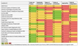 Cette analyse conclue que la plupart des lignes directrices manquaient d’indépendance éditoriale et de rigueur de développement, et étaient presque toutes influencées par la ligne directrice de l’Endocrine Society de 2009 et la ligne directrice WPATH de 2012, qui étaient elles-mêmes étroitement liées.
