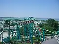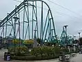 Raptor se situe juste à côté du Blue Streak. Les rails sont de couleur verte avec les supports bleu-vert.