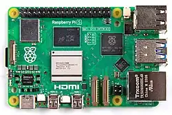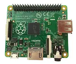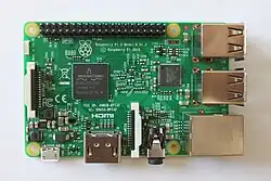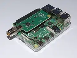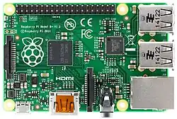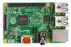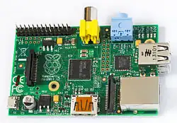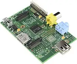 Le Raspberry Pi est un nano-ordinateur monocarte à processeur ARM de la taille d'une carte de crédit conçu par des professeurs du département informatique de l'université de Cambridge dans le cadre de la fondation Raspberry Pi[3].