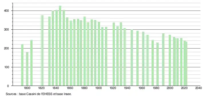 - ↑ Population municipale de référence en vigueur au 1er janvier 2025, millésimée 2022, définie dans les limites territoriales en vigueur au 1er janvier 2024, date de référence statistique : 1er janvier 2022.