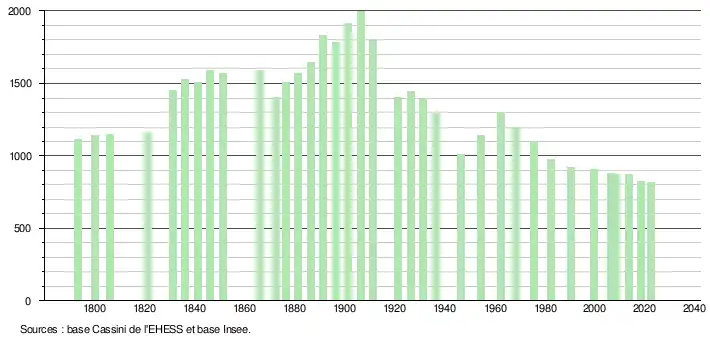 L'évolution du nombre d'habitants est connue à travers les recensements de la population effectués dans la commune depuis 1793. Pour les communes de moins de 10 000 habitants, une enquête de recensement portant sur toute la population est réalisée tous les cinq ans, les populations de référence des années intermédiaires étant quant à elles estimées par interpolation ou extrapolation[25]. Pour la commune, le premier recensement exhaustif entrant dans le cadre du nouveau dispositif a été réalisé en 2008[26].