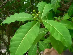 Les feuilles verticillées par 4 (ou parfois 3), de taille inégale, sont elliptiques, les plus grandes de 5-15 cm × 3-5 cm, à base cunéiforme. Les nervures sont très apparentes, saillantes en dessous.