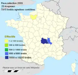 - ↑ Attention la carte livre uniquement la localisation des brebis Rava soumises au contrôle de performances et constituant à ce titre la base de sélection de la race. Cette carte qui ne concerne qu'une fraction de l'effectif global est un bon indicateur de l'aire géographique principale de la race, mais elle peut ne pas la représenter en totalité dans la mesure où d'autres départements que ceux mentionnés peuvent détenir des élevages en race Rava hors contrôle des performances