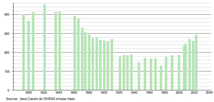 L'évolution du nombre d'habitants est connue à travers les recensements de la population effectués dans la commune depuis 1793. Pour les communes de moins de 10 000 habitants, une enquête de recensement portant sur toute la population est réalisée tous les cinq ans, les populations de référence des années intermédiaires étant quant à elles estimées par interpolation ou extrapolation[18]. Pour la commune, le premier recensement exhaustif entrant dans le cadre du nouveau dispositif a été réalisé en 2008[19].