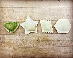 Les raviolis sont traditionnellement confectionnés à base de pâte fraîche, sous de nombreuses formes (carrée, ronde, ovale, demi lune, triangle)[12],[13],[14]. Ils sont également commercialisés sous de nombreuses marques de commerce et de grande distribution.