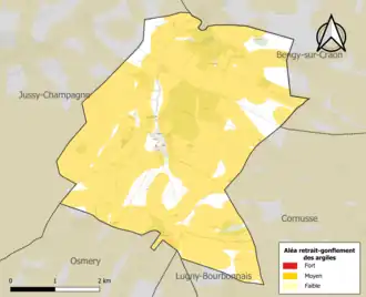 La commune est vulnérable au risque de mouvements de terrains constitué principalement du retrait-gonflement des sols argileux[14]. Cet aléa est susceptible d'engendrer des dommages importants aux bâtiments en cas d’alternance de périodes de sécheresse et de pluie. 84,8 % de la superficie communale est en aléa moyen ou fort (90 % au niveau départemental et 48,5 % au niveau national). Sur les 104 bâtiments dénombrés sur la commune en 2019, 72 sont en aléa moyen ou fort, soit 69 %, à comparer aux 83 % au niveau départemental et 54 % au niveau national. Une cartographie de l'exposition du territoire national au retrait gonflement des sols argileux est disponible sur le site du BRGM[15],[Carte 2].