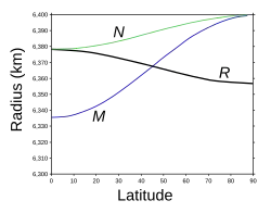 La Terre n'est pas parfaitement sphérique et les distances entre sa surface et son centre varient de 6 352,8 km (fond de l'océan Arctique) à 6 384,415 km (sommet du Chimborazo)[1]. Le rayon équatorial est de 6 378,137 0 km, alors que le rayon polaire est de 6 356,752 3 km, ce qui mène à un modèle ellipsoïde de sphère aplatie aux pôles.