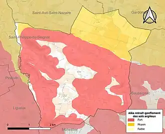Les mouvements de terrains susceptibles de se produire sur la commune sont des tassements différentiels[40]. Le retrait-gonflement des sols argileux est susceptible d'engendrer des dommages importants aux bâtiments en cas d’alternance de périodes de sécheresse et de pluie[41]. 83,3 % de la superficie communale est en aléa moyen ou fort (58,6 % au niveau départemental et 48,5 % au niveau national métropolitain)[Carte 4]. Depuis le , en application de la loi ÉLAN, différentes contraintes s'imposent aux vendeurs, maîtres d'ouvrages ou constructeurs de biens situés dans une zone classée en aléa moyen ou fort[Note 4],[42].