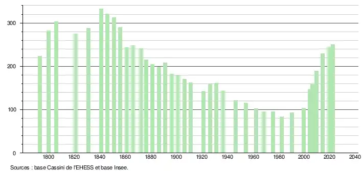 L'évolution du nombre d'habitants est connue à travers les recensements de la population effectués dans la commune depuis 1793. Pour les communes de moins de 10 000 habitants, une enquête de recensement portant sur toute la population est réalisée tous les cinq ans, les populations de référence des années intermédiaires étant quant à elles estimées par interpolation ou extrapolation[29]. Pour la commune, le premier recensement exhaustif entrant dans le cadre du nouveau dispositif a été réalisé en 2004[30].